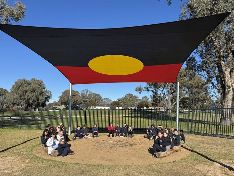 This year, Springdale Heights Public School was proud to create a Yarning Circle with the support of our Deadly Student Committee and the Albury Aboriginal Education Consultative Group (AECG). The Yarning Circle is a special place at the heart of our school where students, staff, and community members can come together to share stories, build understanding, and strengthen connections. It provides a culturally safe and respectful space for learning, reflection, and celebration of Aboriginal and Torres Strait Islander perspectives. We use our Yarning Circle for class discussions, wellbeing activities, cultural learning, and important gatherings; a true symbol of unity, respect, and belonging within our school community.